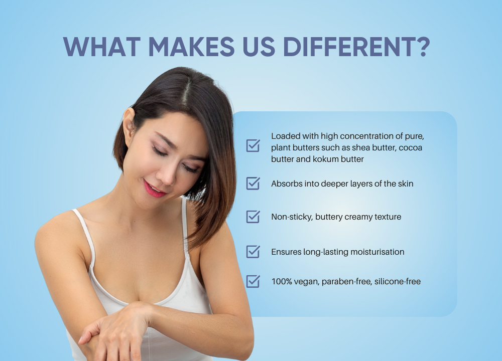 | Full Transparent Ingredient List | Aqua, Shea Butter, Almond Oil, Arrow Root, Cocoa Butter, Emulsifying Wax, Kokum Butter, Glycerin, Disodium EDTA, Vitamin E, Fragrance |