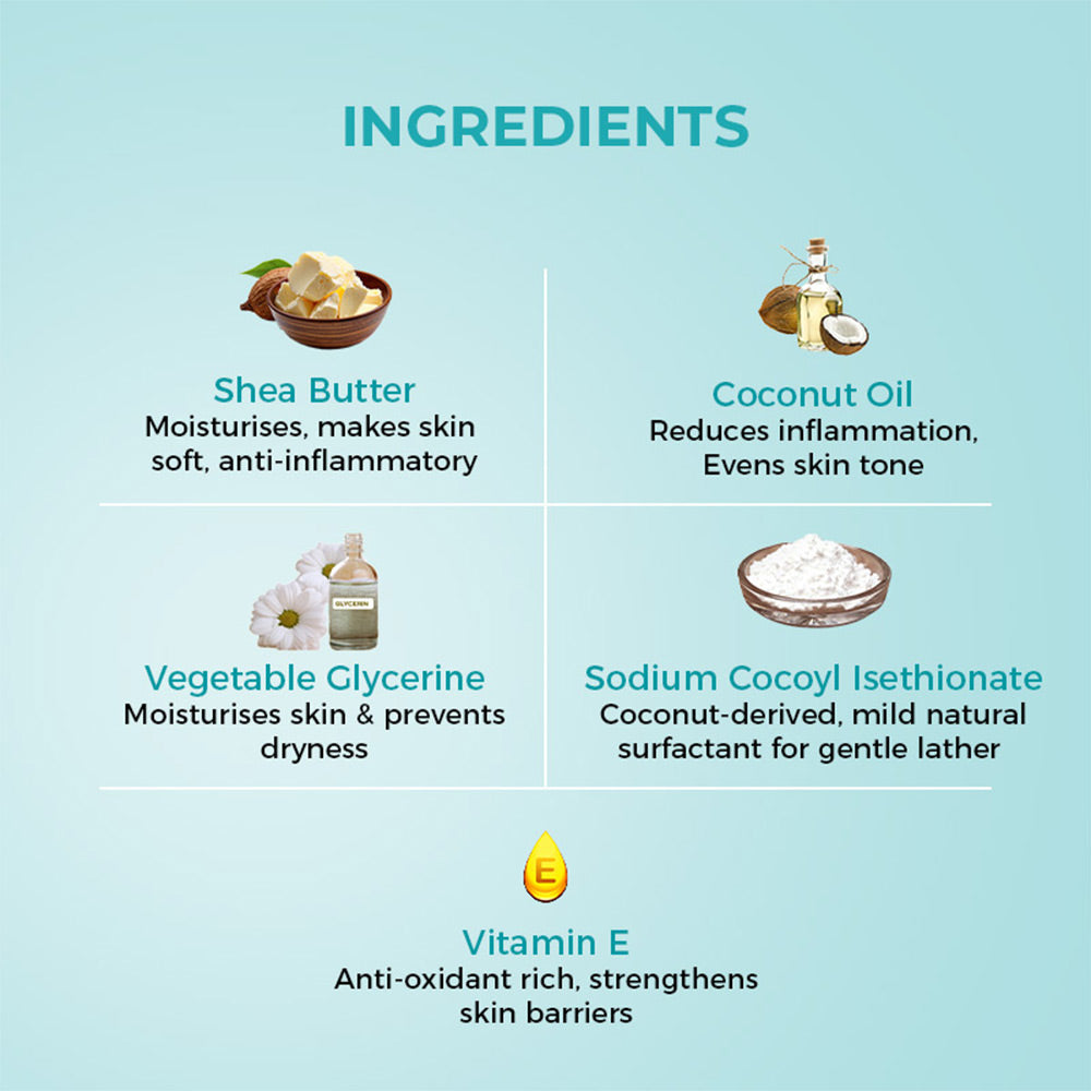 | Full Transparent Ingredient List | Sodium Cocoyl Isethionate (Coconut Derived), Cocamidopropyl Betaine (Coconut Derived), Glycerin, Aqua, Shea Butter, Stearic Acid, Sorbitol, Sodium Lactate, Coconut Oil, Phenoxyethanol, Colour, Fragrance, Vitamin E |