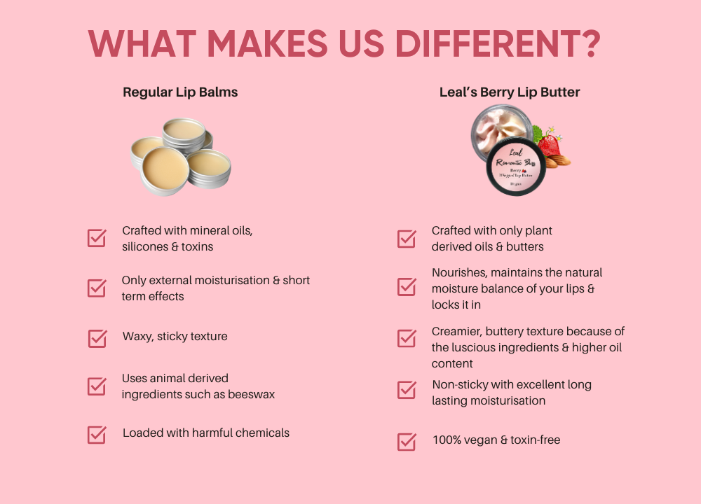 Lip butter tends to have a richer, creamier texture than a lip balm. While both products aim to moisturize the lips, lip butter often contains a higher concentration of nourishing ingredients & is better suited for dry, chapped lips.